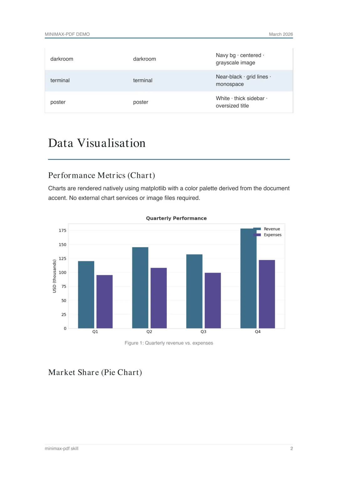 封面的设计感是实打实的——深色背景、Playfair Display 字体、点阵纹理装饰,这个质量纯靠 Python 绘图库达不到。正文包含 callout 框、数据表格、柱状图、饼图,图表由 matplotlib 本地渲染,无需外部服务。