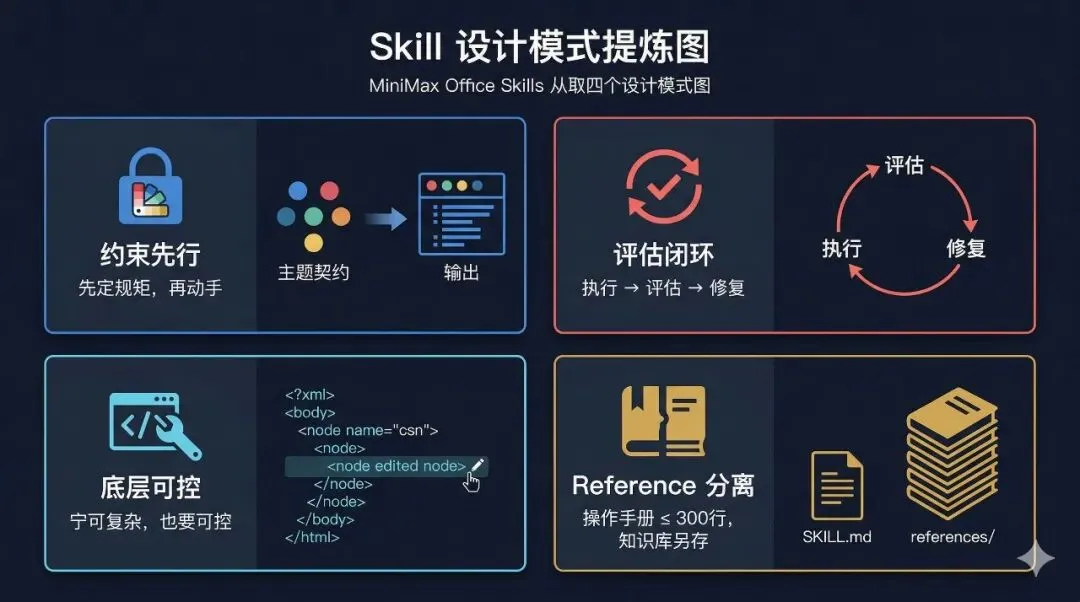 拆完四个 Skill 的源码,几个跨 Skill 的共性模式浮出水面。这些模式不只适用于 Office Skill,对任何需要 AI 生成结构化输出的 Skill 都有参考价值。