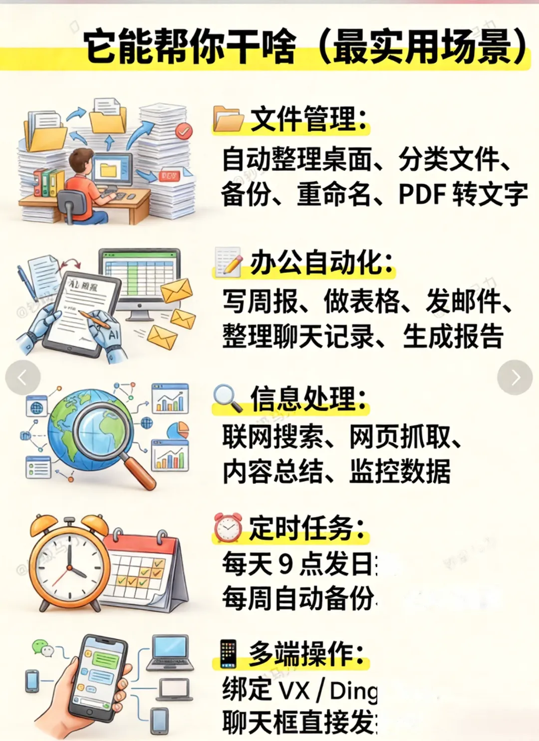 信息处理:联网搜索、网页抓取、内容总结、数据监控、定时任务。