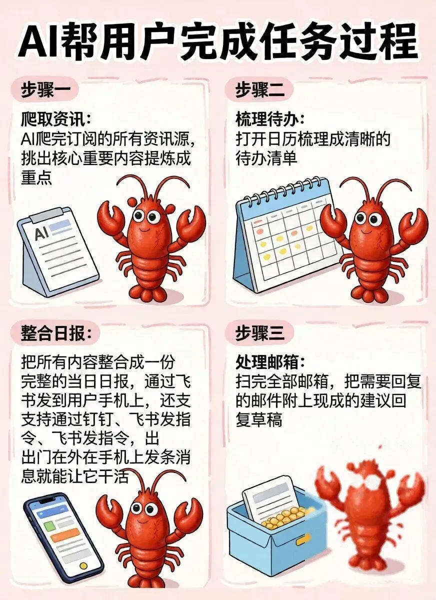 有人设了个每天早上8点自动执行的任务:先爬完所有订阅资讯、提炼重点;再梳理当天日程生成待办清单;接着扫完邮箱、拎出需回复的邮件并附上建议草稿;最后整合成日报,通过飞书推送到手机。