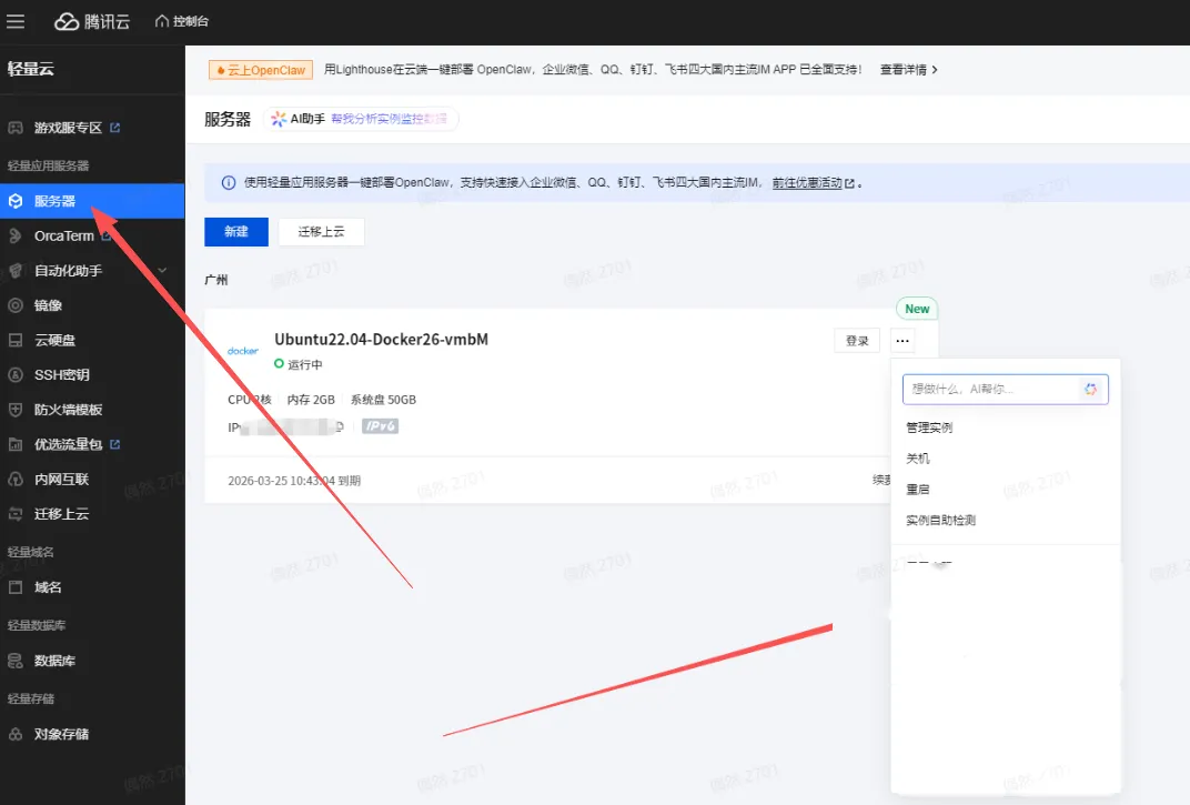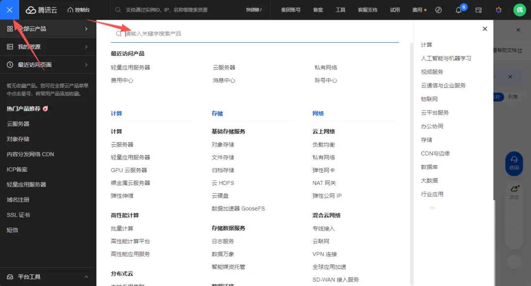 提示:左侧菜单找不到服务器选项的话,点击三条杠搜索"轻量应用服务器"。