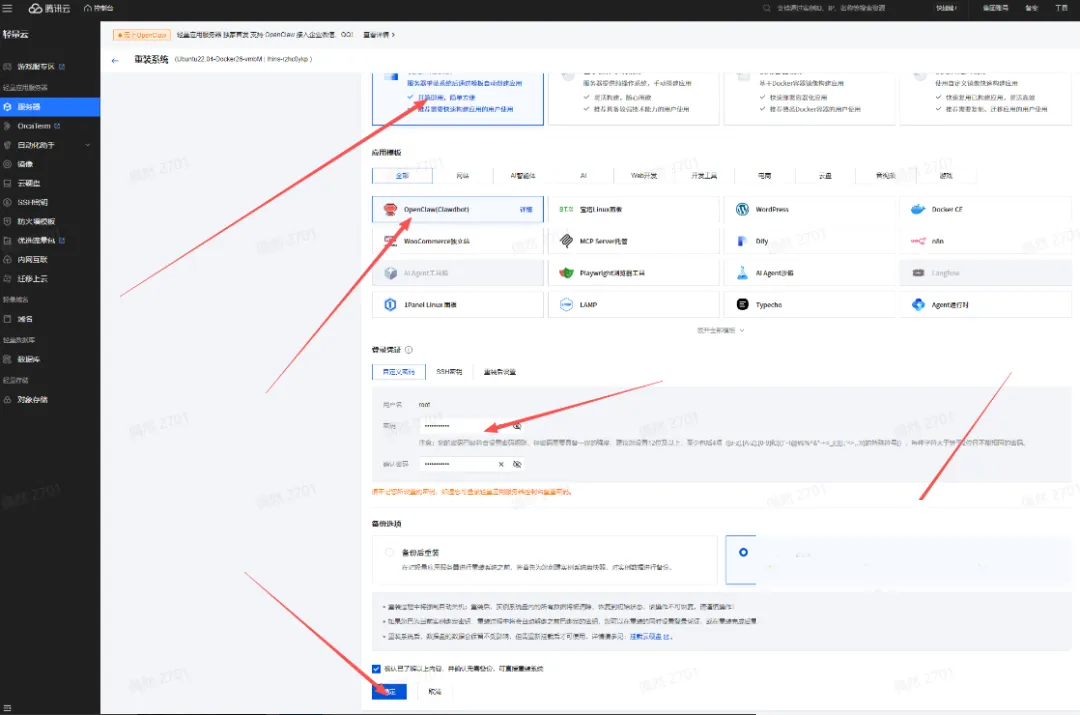 重装界面选择小龙虾镜像,设置登录密码(务必记住)。