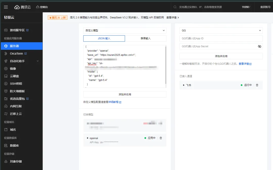 在这里配置大模型。如需接入飞书、QQ、企业微信、钉钉,填写对应信息即可。
