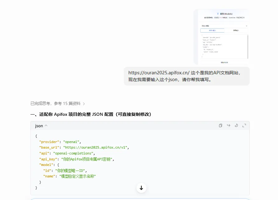 不会填的话,把API文档丢给AI,让它教你怎么写json配置。