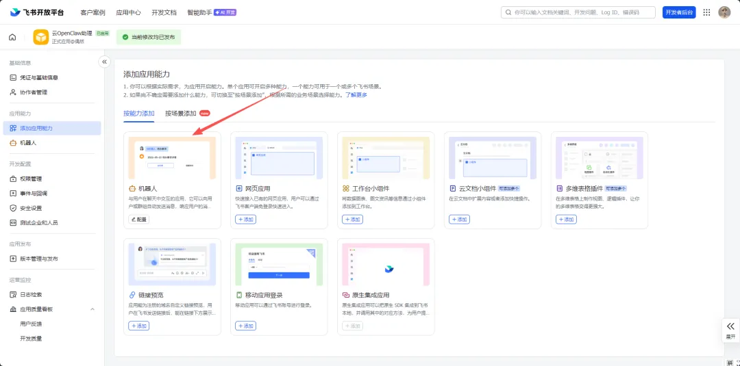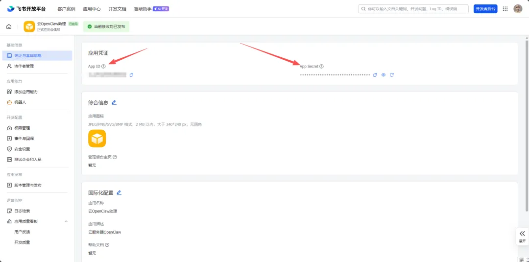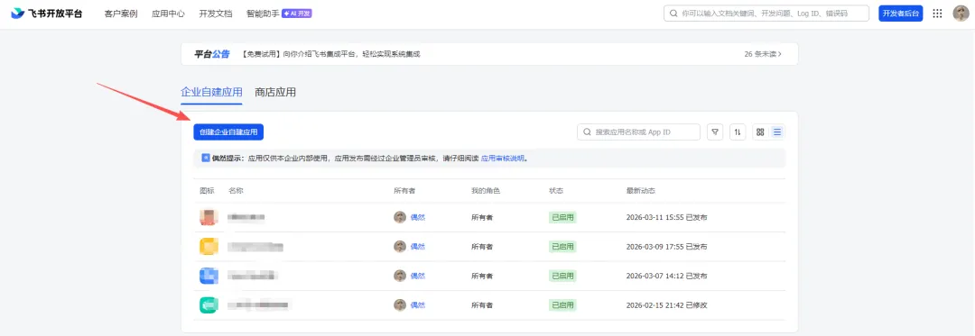 配好模型后,接入飞书。进入飞书开发者后台(https://open.feishu.cn/app),创建应用。