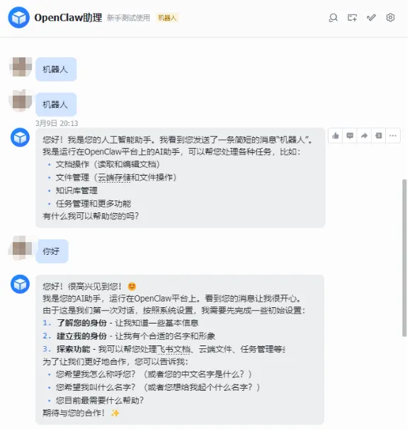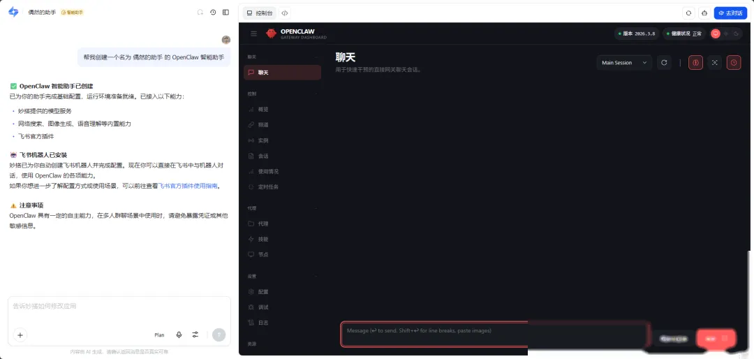 到这里就搭建完成了,可以开始使用你的OpenClaw助手了。