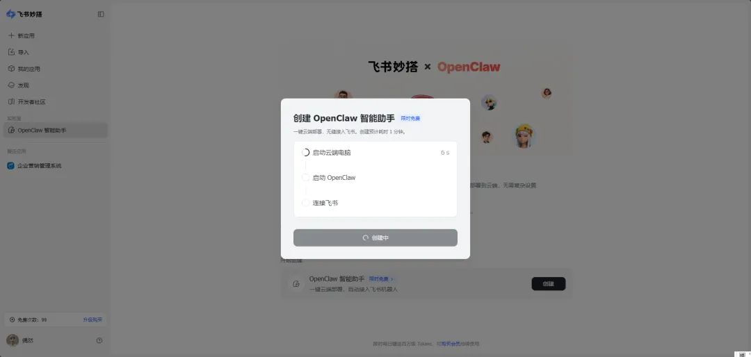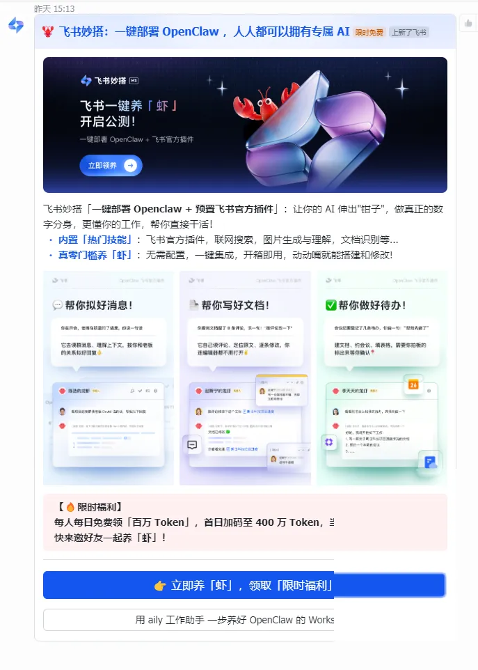觉得上面太麻烦?飞书最近推出了秒搭功能,目前每天赠送400万token,对新手极其友好。