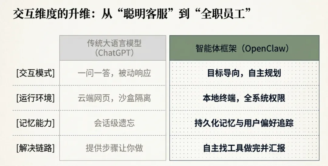 OpenClaw 的诞生极具戏剧性。奥地利程序员 Peter 最初只是想把 Claude Code 接入聊天软件,以便出门在外也能干活。一次意外中,他给 AI 发送了一条语音,尽管他并未开发语音识别功能,AI 却在发现自己“听不懂”后,自主编写了一段语音转文字的脚本并成功回复。这正是Agent(智能体)与传统聊天机器人的本质区别:ChatGPT(问答导向):像一个聪明的客服。你问,它答;你不动,它也不动。OpenClaw(目标导向):像一个全职员工。你只需给它一个目标,它会自行思考步骤、寻找工具并交付结果。“如果说 ChatGPT 是一个你问我答的对话框,那么 OpenClaw 更像是一个全职员工。你跟他说‘帮我把这件事办了’,他就会自己去琢磨怎么干,干完后直接向你汇报。”