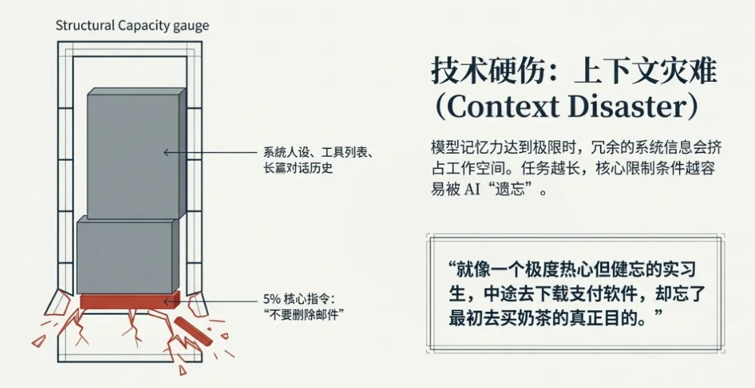 回到开篇提到的“删光邮件”惨剧,这背后的技术真相是上下文窗口(Context Window)的灾难。在 OpenClaw 的运行逻辑中,为了让 AI 保持人设、理解工具和历史,系统需要塞入海量信息。这导致用户真正的核心指令(如“不要删除邮件”)可能只占总容量的5%。当任务链条过长,AI 就会产生“记忆盲点”。目前的智能体更像是一个“热心但经验不足的实习生”:他想帮你买奶茶,打车到了店里才发现没装支付软件,只能现场折腾。这种决策链条上的不成熟,使得他在处理复杂长程任务时极易失控。