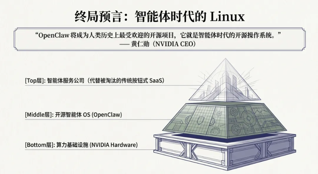 在 GTC 2026 大会上,英伟达 CEO 黄仁勋给出了极高的评价:OpenClaw 是“Linux 级别”的开源项目。“它是智能体时代的开源操作系统。在未来,所有的 SaaS(软件即服务)公司都将消失,取而代之的是智能体服务公司。”这意味着我们正在告别“人点击按钮”的旧时代。虽然目前仍有安全暗礁和技术硬伤,但当 AI 能够独立管理你的日程、财务和工作流时,一个属于每个人的“私人 AI 助理”时代已经到来。当 AI 不再只是陪你聊天的窗口,而是能操纵你数字世界的双手,你准备好交出权限了吗?