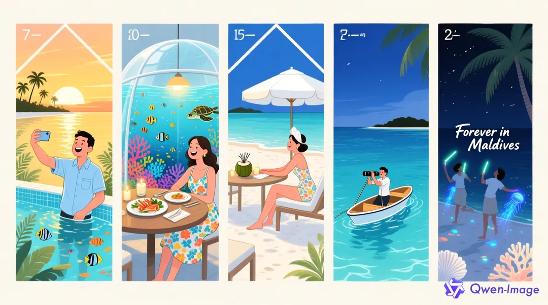 “我计划明年1月去马尔代夫,预算4-5万/人。我和女友是典型的‘颜控’+‘吃货’,首要条件是拍照必须出片(要有无边泳池和白色沙滩),必须有水下餐厅,饮食要好(最好有中文菜单或中餐)。我们不喜欢坐太久的船,晕船。请帮我推荐3个岛屿,并排出优缺点。”
