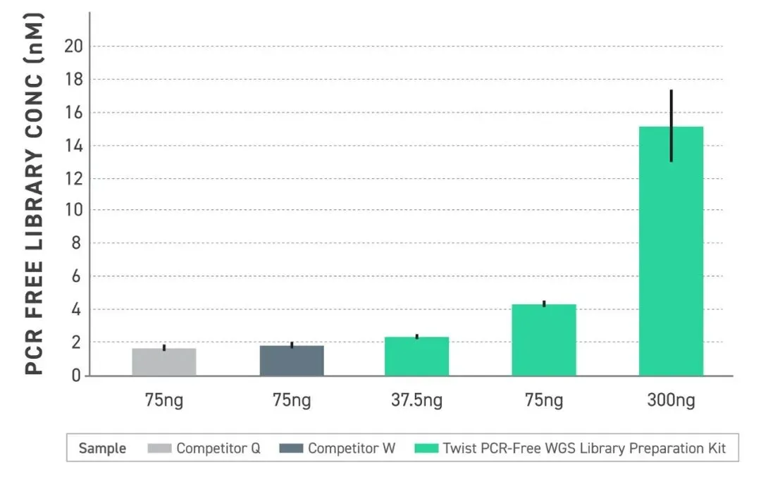 图 1.不同起始量下PCR -Free文库产量的比较。使用所示 DNA 起始量进行无 PCR 文库制备后,测量最终文库浓度 (nM)。在相同起始量下,Twist PCR -Free全基因组测序文库制备方法比其他方法获得更高的文库产量,并且在较低起始量下也保持了良好的性能。