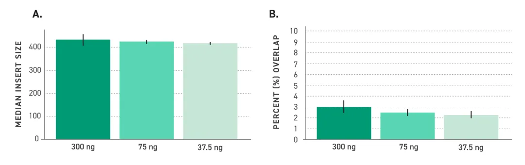图 2. 该试剂盒在广泛的 DNA 样本范围内可生成一致的长插入片段。(A) 展示了以NA12878 基因组 DNA 300 ng、75 ng和37.5 ng 为起始量的中位插入片段大小。(B) 展示了 300 ng、75 ng 和 37.5 ng 的NA12878 样本起始量的重叠(Read1和Read2的重叠)百分比(衡量双端测序测序片段冗余覆盖相同 DNA 碱基的程度)。