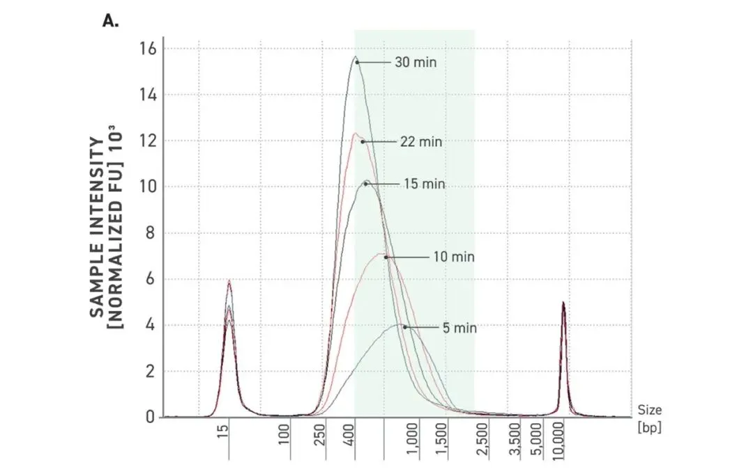 A:不同片段化时间生成的NGS文库5张电泳图。 50 ng高质量gDNA在 32°C 下进行不同时长的片段化。