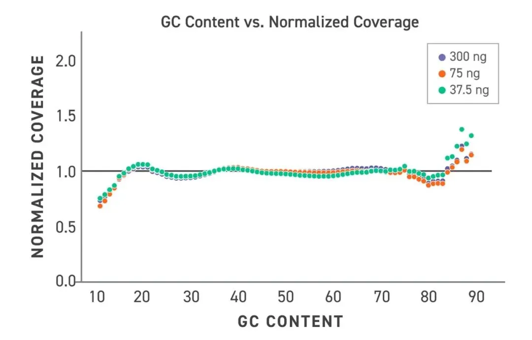 图 4. Twist PCR-Free 全基因组测序文库制备试剂盒在不同 GC 含量下提供更一致且均一的覆盖度分布。该试剂盒即使在低起始量下也能将 GC 偏好控制在较低水平,无需额外测序即可获得均一覆盖,提升高 GC 与低 GC 含量区域的变异检出能力。