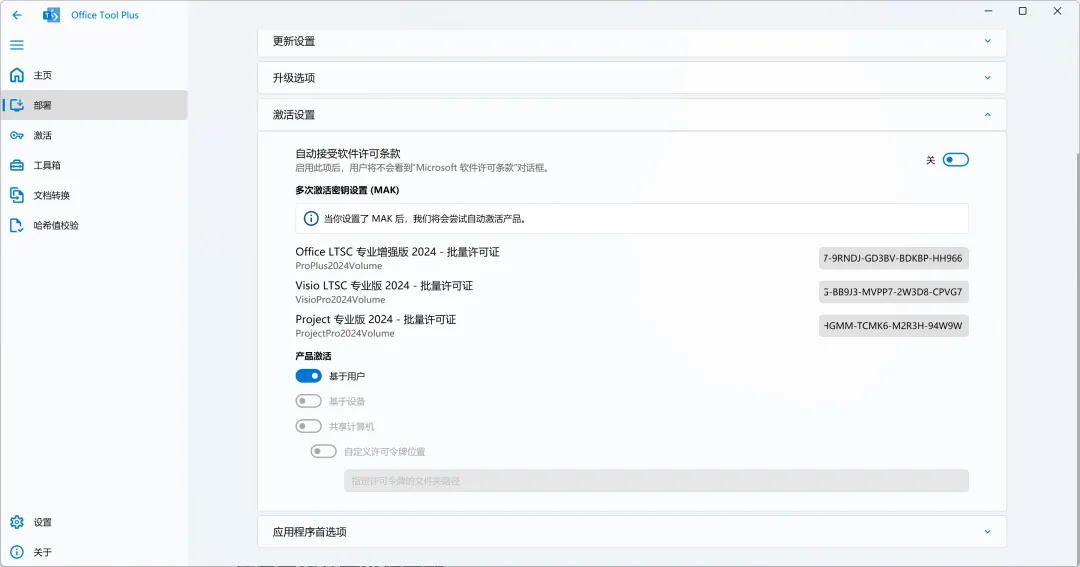展开【激活设置】,为刚才添加的 2024 产品填入 MAK 密钥。