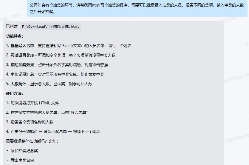 你负责策划公司的年会,年会上有个抽奖的环节。网上搜一下,抽奖的小程序不是要收费就是广告满天飞,这个时候,你就可以让你的OpenClaw花1秒钟的时间写一个;