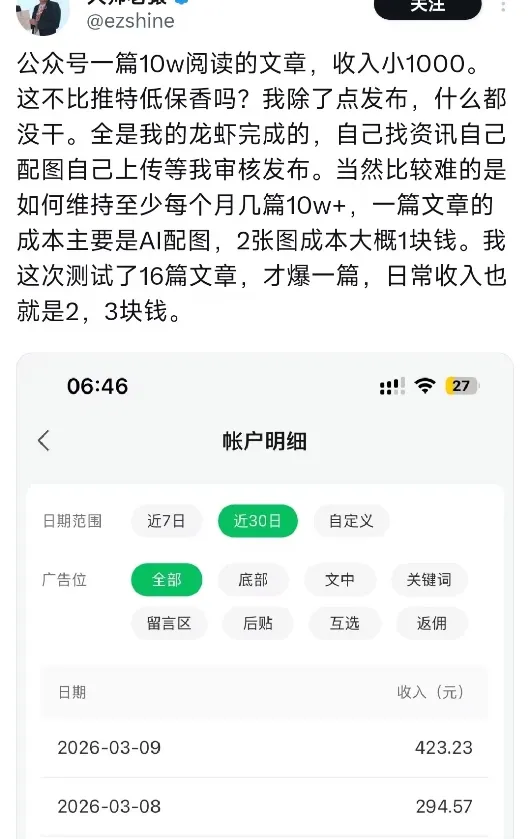 运营自媒体赚钱: 注册好自媒体账号之后交给OpenClaw,让他自己运营,自己选题,自己创作,自己发布,我们完全当甩手掌柜。看一个具体的案例