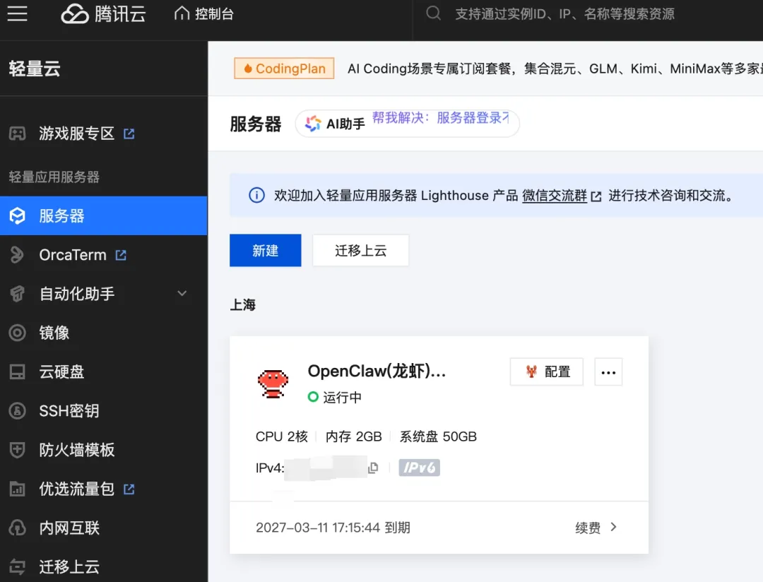 选择你需要的配置购买,个人用的话,2核2G4M的配置就足够了。买完进入轻量云服务器的控制台,就能看到刚刚购买的服务器实例:
