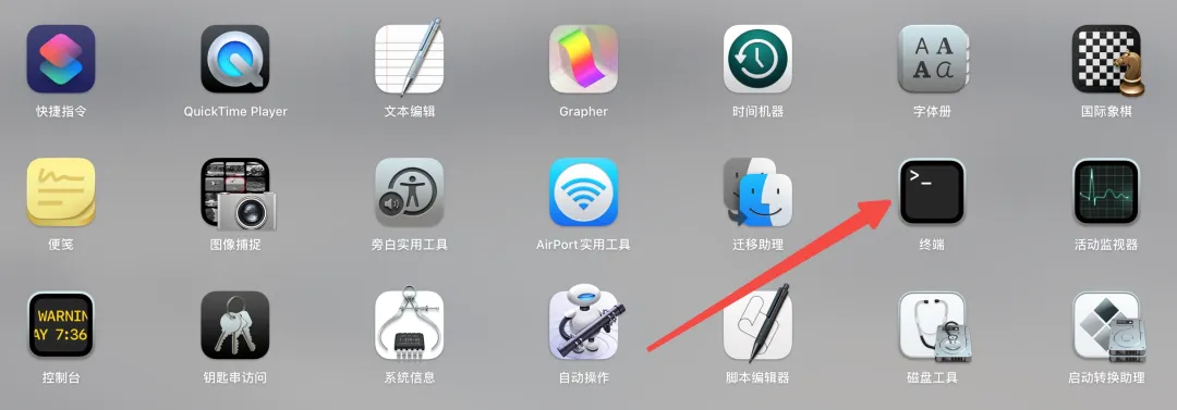 进入启动台,找到【终端】程序。(如果找不到用command+空格快捷键启动搜索工具,然后在搜索工具中输入终端来搜索这个程序)