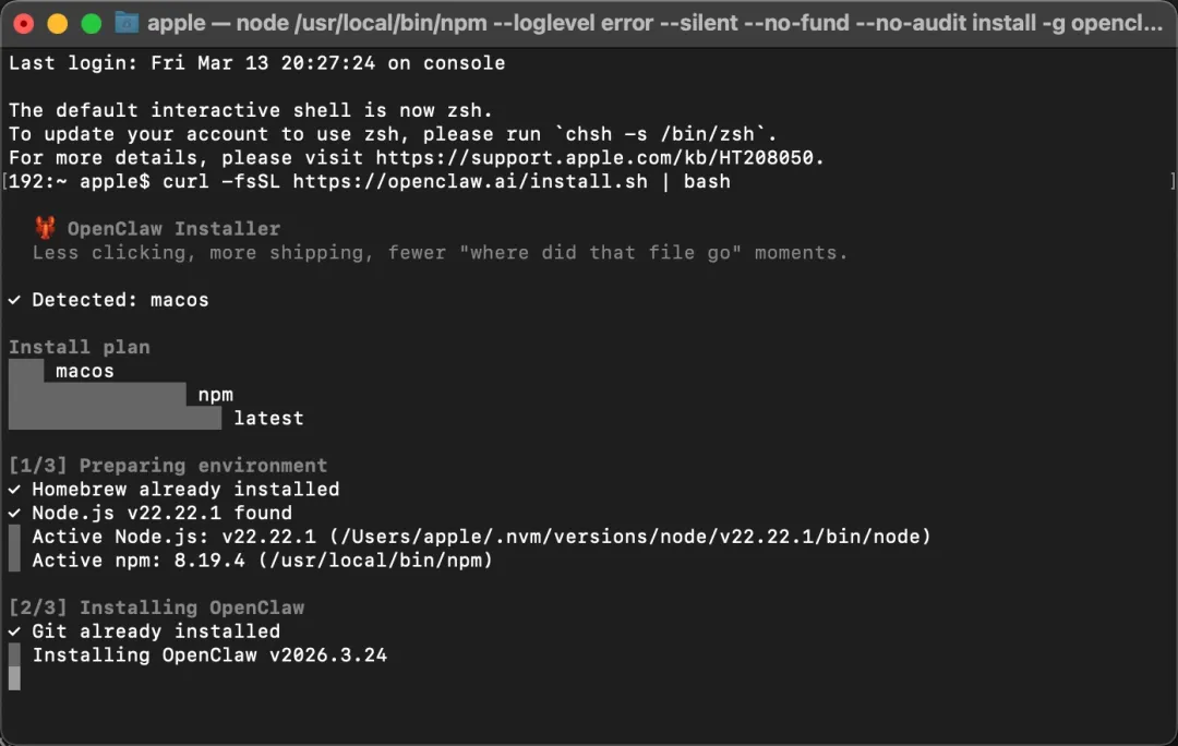 curl -fsSL <https://openclaw.ai/install.sh> | bash复制之后粘贴到命令行的窗口里,然后点击键盘的回车键,他就自动开始安装了