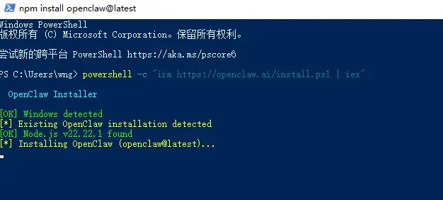 powershell -c "irm <https://openclaw.ai/install.ps1> | iex"然后粘贴到命令行窗口,这里粘贴有个技巧,大部分人粘贴内容的第一反应是使用键盘快捷键Ctrl+V,但是这个快捷键在命令行窗口里是没有用的,可以单击鼠标右键来实现粘贴,粘贴之后敲一下键盘的回车键,就可以看到安装开始了: