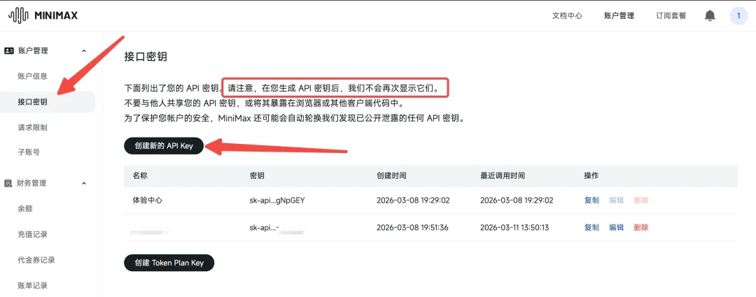 打开账户管理下的接口密钥页面,如果没有接口密钥的话,可以点击【创建新的API Key】按钮创建密钥,创建之后复制下来,后面配置OpenClaw的模型时会用到。