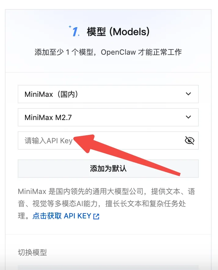 下面以MiniMax为例,演示一下怎么获取配置OpenClaw的模型所需的参数。