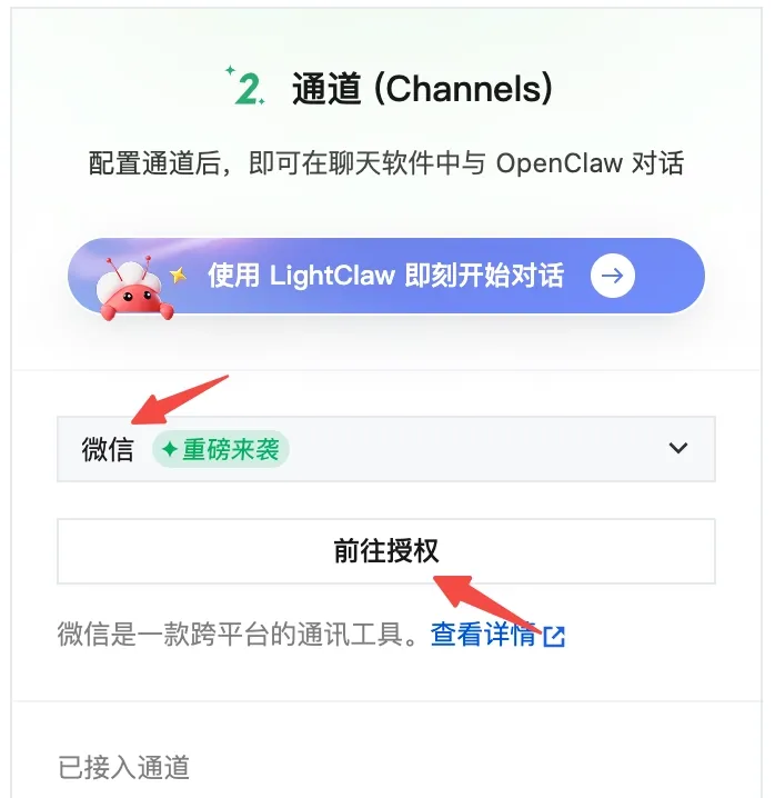 消息通道:目前OpenClaw支持的消息通道有:飞书,钉钉,企业微信,QQ,微信。是的,微信也支持绑定OpenClaw了。下面的消息通道的绑定,我们会以微信为例进行演示。