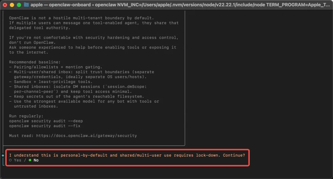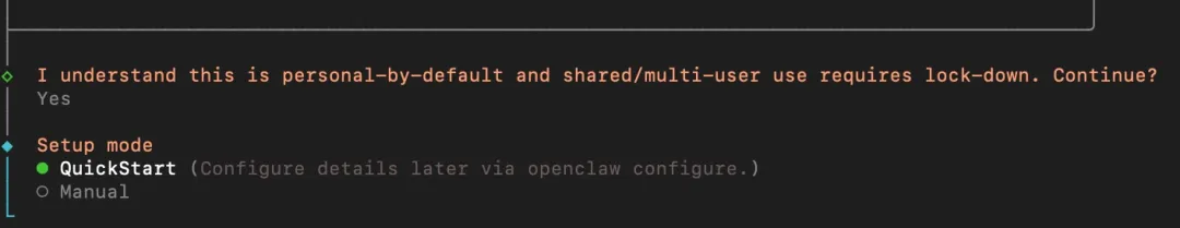 openclaw onboard进入到配置流程之后,第一步进入一个简单的提示,然后询问我们是否继续?下面有Yes和No两个选项,我们可以用键盘左右的方向键调整亮点的位置,我们需要按一下左键,将亮点的位置调整到Yes上面,然后点击回车进入到下一步