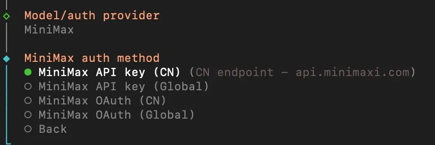 第四步进入到模型鉴权方式的选择,我们选择第一个MiniMax API key(CN),然后回车