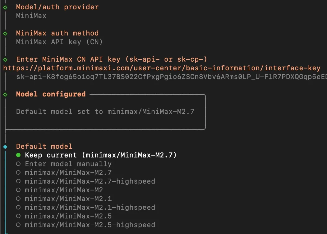 第三步进入到模型配置,可以用键盘的上下键来选择模型,因为我们已经有了MiniMax的API Key,所以我们选择MiniMax,然后回车