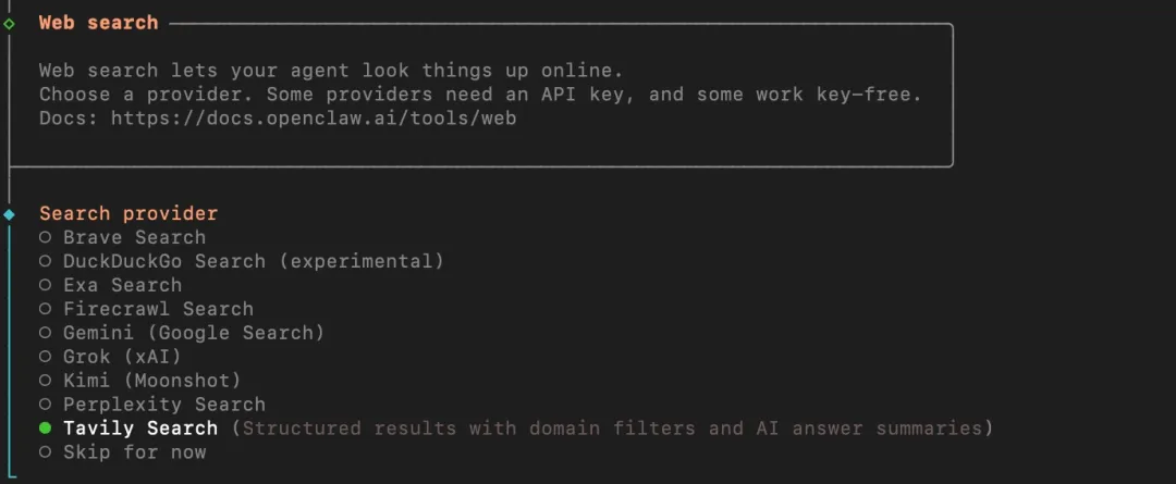 第八步选择搜索工具,搜索工具是给openclaw的百度或者谷歌,这里我比较推荐实用Tavily Search,每个月有1000次搜索的免费额度,轻度使用基本足够,如果暂时不需要的话,可以选择Skip for now,先跳过