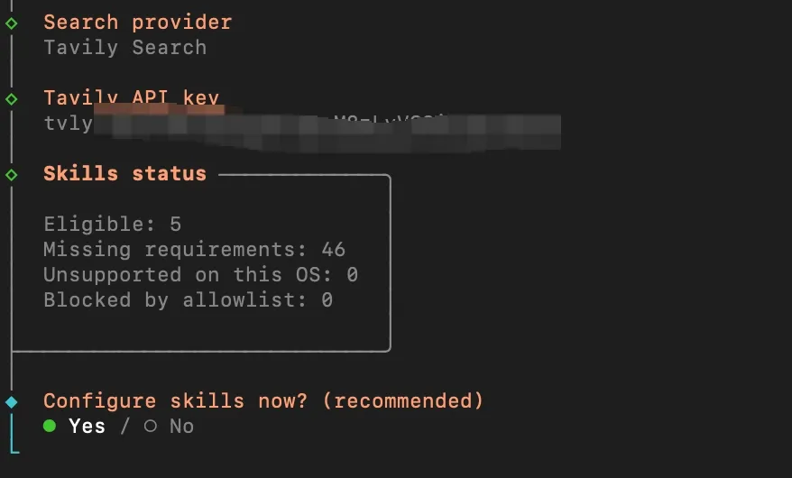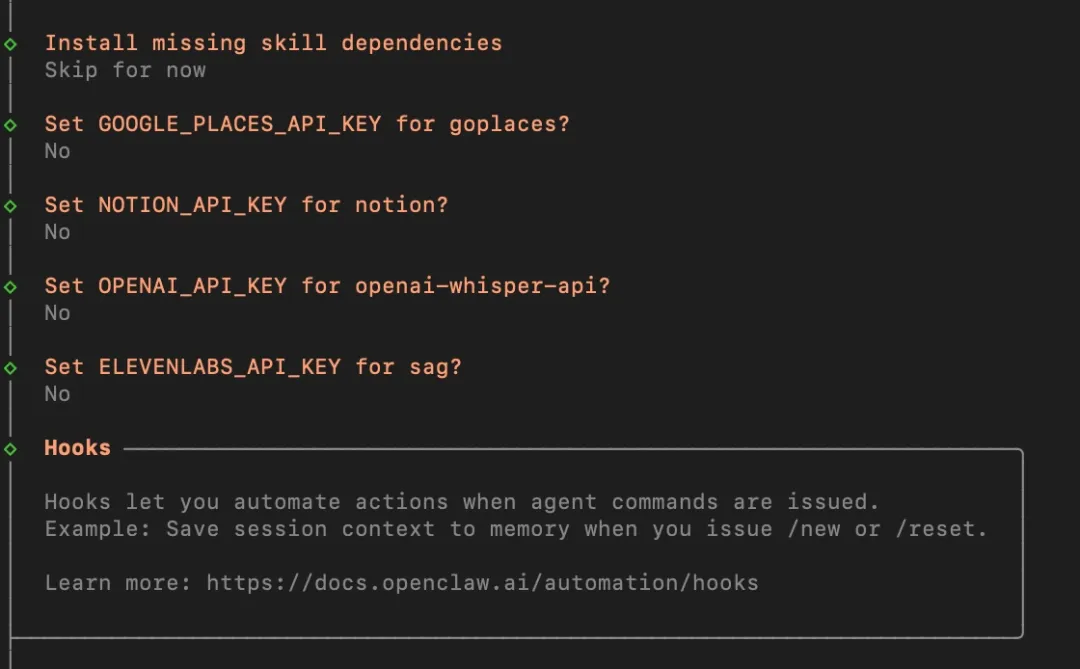 Skill可以按需安装,后面使用的过程中需要什么再安装,这里可以选择No,接下来是配置一些内置Skill的API Key,可以一路No,后面如果有需要,随时都可以再配置;