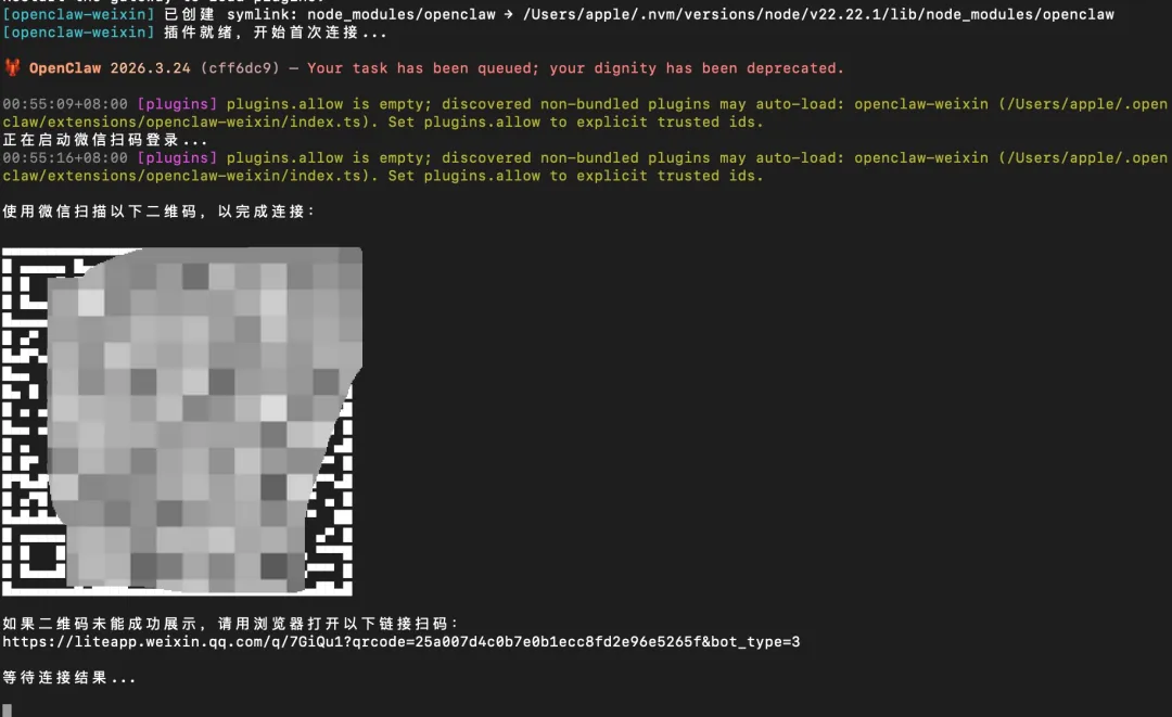 npx -y @tencent-weixin/openclaw-weixin-cli@latest install就会自动安装微信的插件,等一会,安装完成之后会自动启动连接流程,在命令行会出现二维码