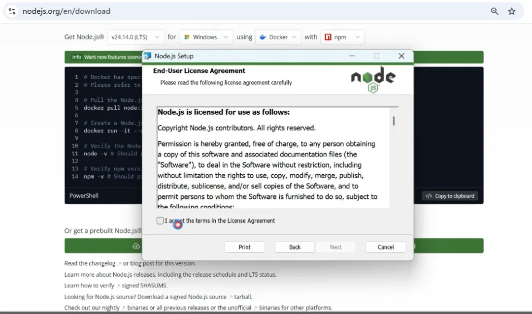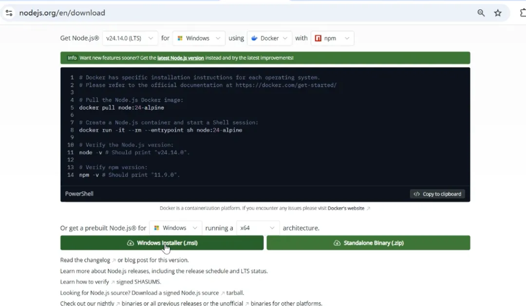 从https://nodejs.org/en/download下载windows 安装镜像,版本不低于22即可。iwr命令会检查node版本,如果没有安装或者版本号小于22,会下载安装(用winget/Chocolatey/Scoop进行尝试),只有安装失败后才会提示用户自行安装。选择LTS(稳定版本下载)