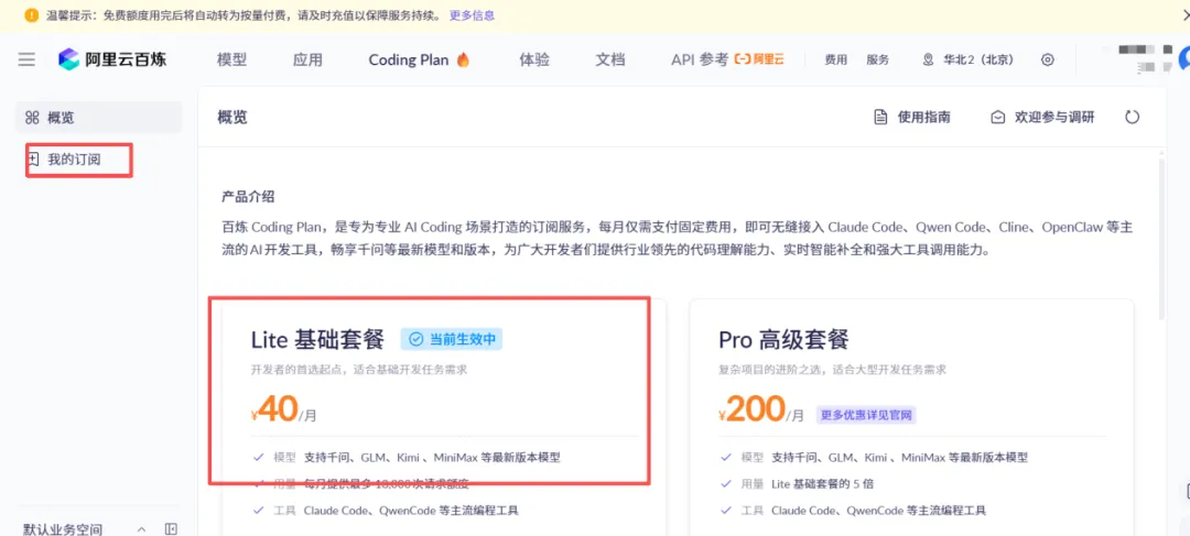 如果不使用免费版通义千问,则需要自己准备收费版大模型API key,笔者购买了阿里百炼的Coding plan套餐和deepseek 充值套餐,下面是阿里百炼界面。
