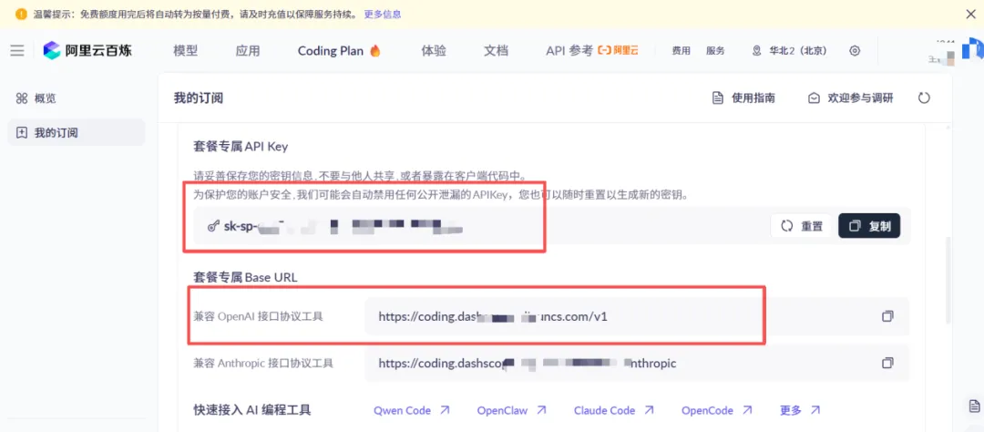 在阿里云百炼平台,点击“我的订阅”,下面获得BaseURL和API key。(其他平台的BaseURL和API key获取方式大同小异)。