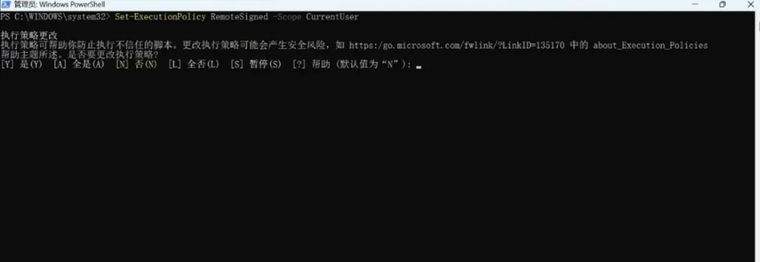 注意:powershell要提前进行如下设置解锁powershell的安全设置,如果出现确认都输入Y确定。