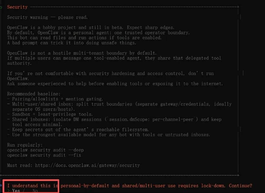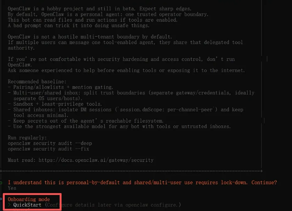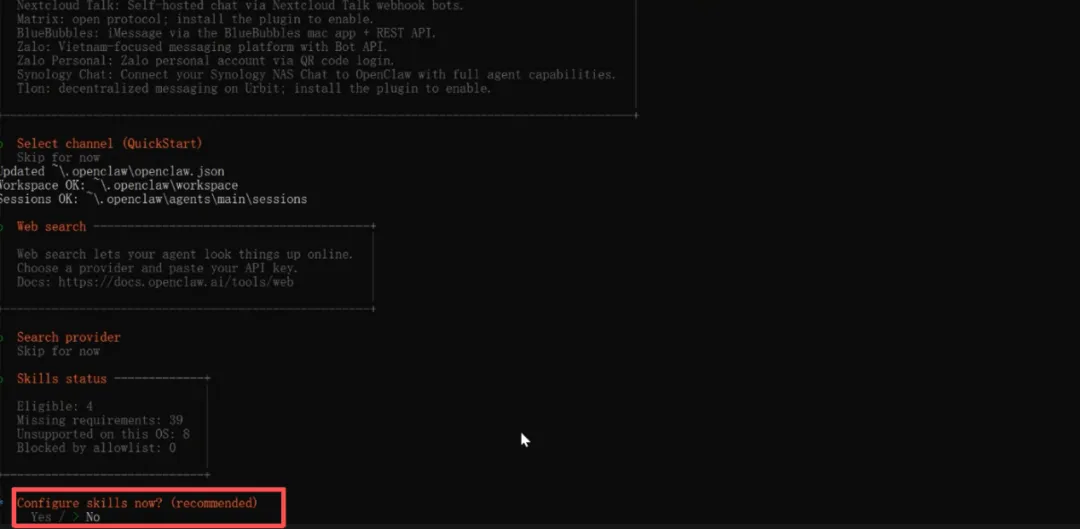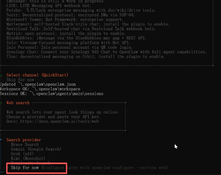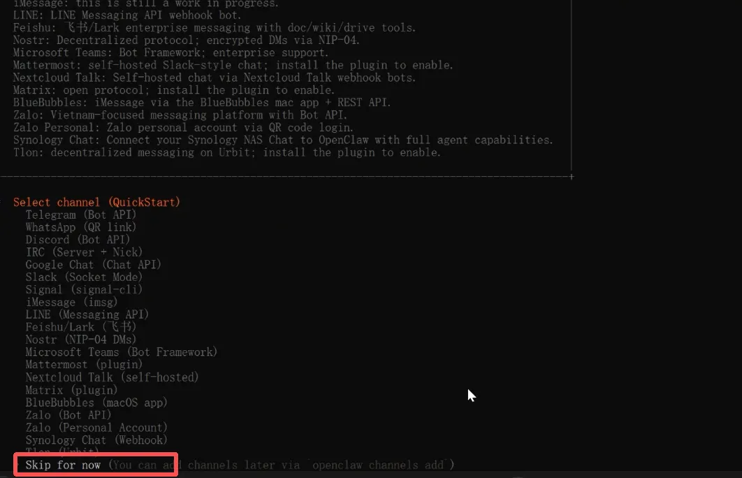 Select channel选择 Skip for now(后面在接入QQ,企业微信,飞书,钉钉部分再配置)