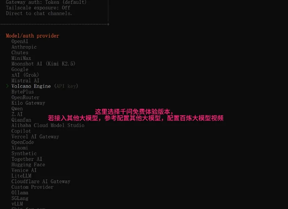 在openclaw安装完成之后,需要接入大模型(例如:deepseek,阿里云百炼,腾讯,openAI等大模型)才能使用人工智能功能,所以在开始之前需要准备好。在配置大模型供应商后,openclaw要与大模型后台通信进行鉴权认证,认证通过后才能继续配置。