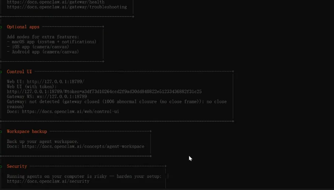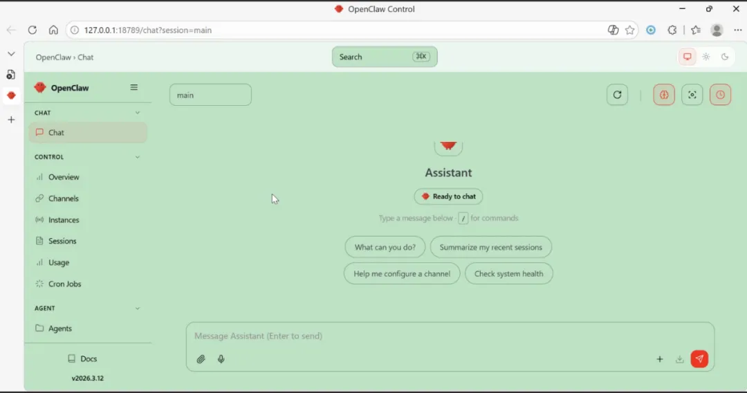 把Dashboard URL 粘贴到浏览器查看web UI对话框。(如果打不开,需要等gateway启动完成,也可以运行openclaw doctor进行问题检查)(注意:这里要保持电脑插着电源,否则可能启动不了服务)