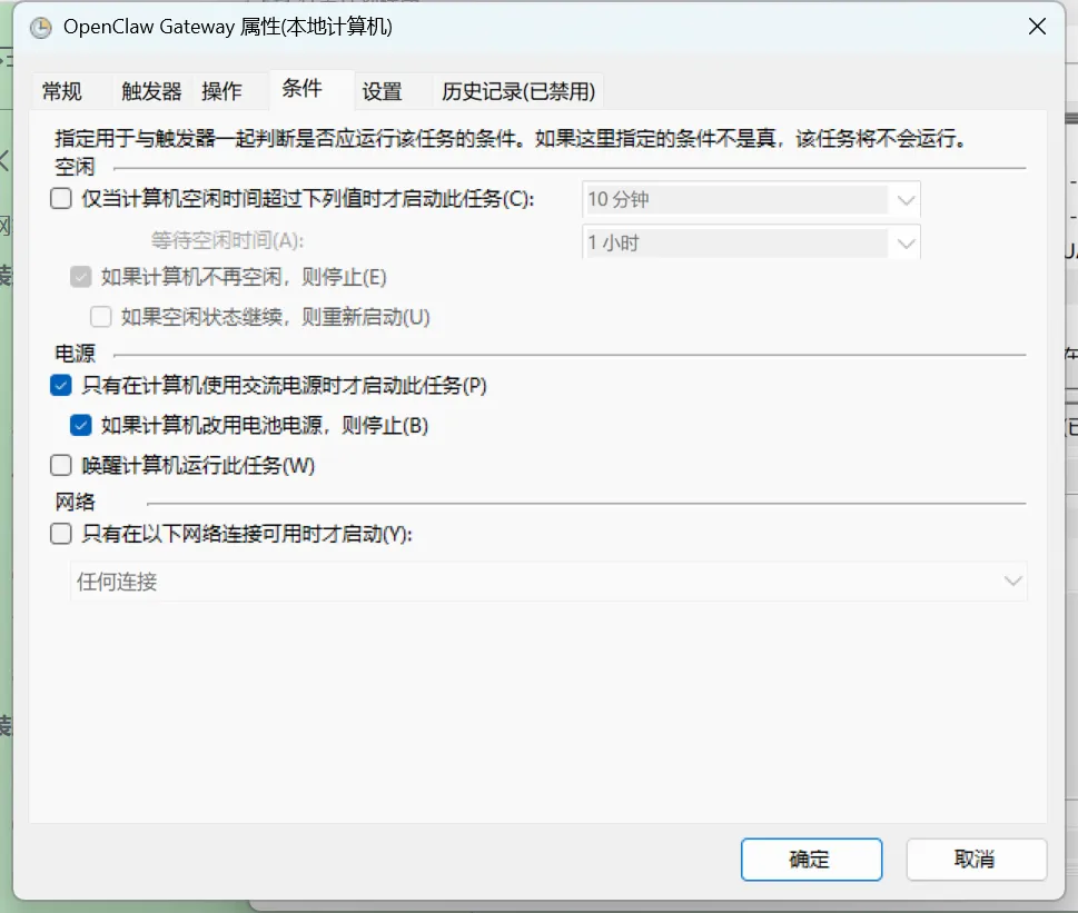 1.在windows下要确保电脑连接电源,使用电脑电池供电时不能试用gateway服务。windows任务计划程序中,openclaw启动条件默认是交流电供电时才能运行。