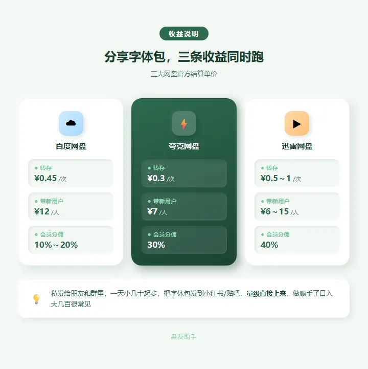 设计师找字体,自媒体人找字体,做PPT的人找字体,剪视频加字幕需要字体,做海报需要字体,甚至写公众号也有人专门找好看的字体,不像考试资料有淡旺季,字体这个东西,每天都有人在找,有稳定需求的地方,就有稳定的流量,目前百度网盘、夸克网盘、迅雷网盘,都有自己的推广体系,所以他们愿意把这个事儿外包给普通人——你帮它带来用户或者带来保存行为,它就给你钱,第一种:你分享的字体包,被一个从来没用过百度网盘的新人点进来,他注册了账号,这叫带来新用户,百度网盘给你¥12,夸克给你¥7,迅雷给你最高¥15,第二种:他本来就有网盘账号,只是进来把你分享的字体包保存了,这叫转存,百度给你¥0.45,夸克给你¥0.3,迅雷给你¥0.5~1,这两件事同时都在发生,你只需要分享一次,
