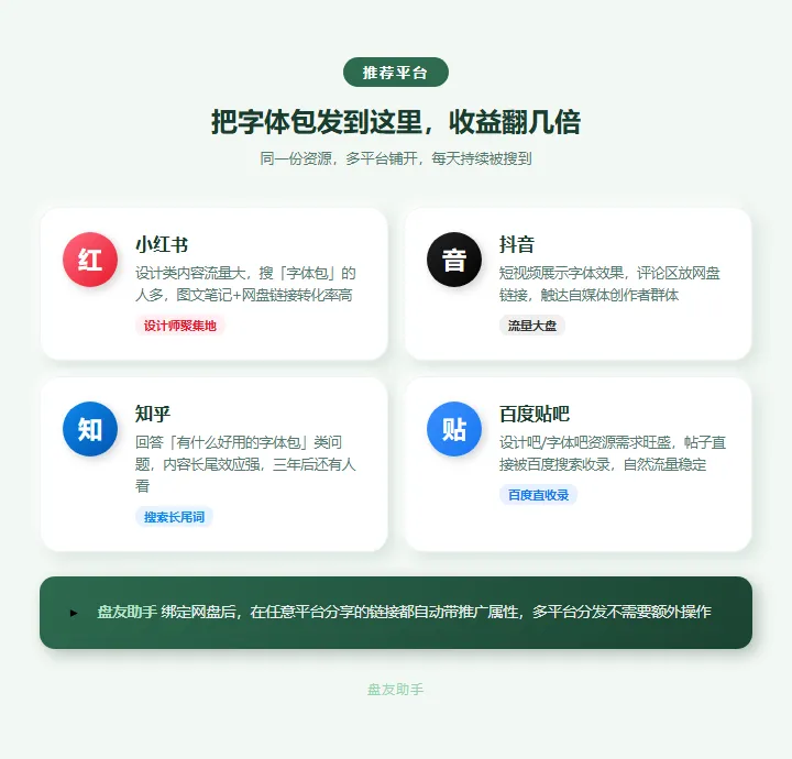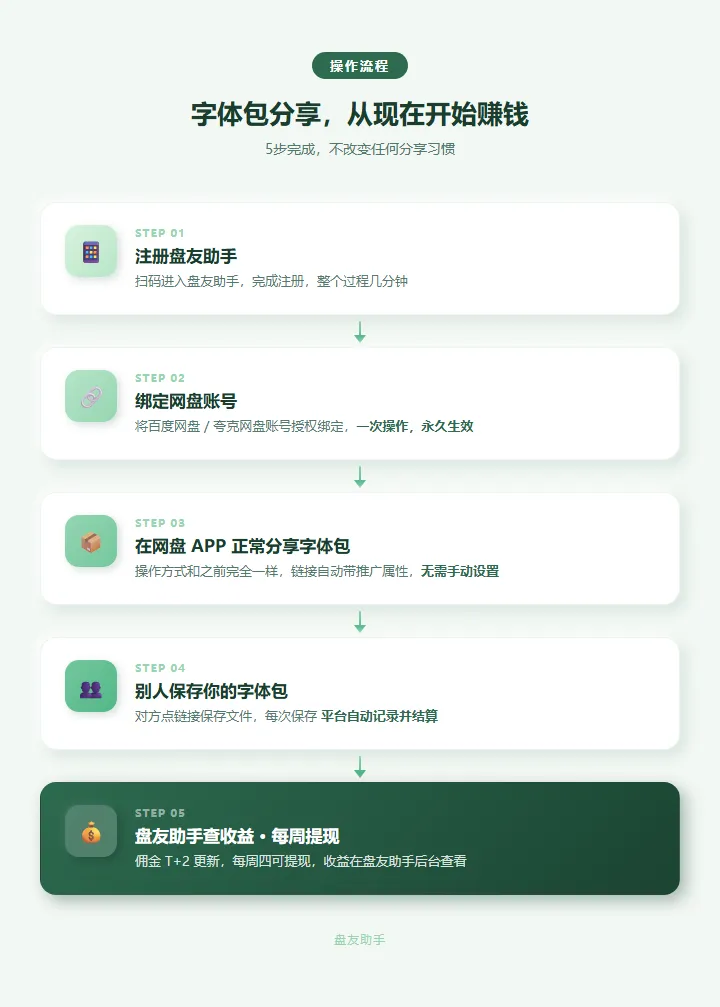 不是所有资源都适合,字体包有几个特质,让它在这里特别好使,第一,用户保存意愿强,设计师找到一套喜欢的字体,一定会存起来,保存率高,第二,搜索长期稳定,今天发了一个字体包,三个月后还有人搜到,还有人转存,这不是一次性的买卖,是时间复利,第三,字体分类多,可以持续输出,扫码注册,绑定你的百度网盘/夸克网盘/迅雷网盘账号,这步完成之后,你从这个网盘里分享出去的链接,就自动带上推广属性了,注意不是在盘友助手里生成链接,是你在网盘APP里正常分享,第二步,整理你的字体资源,越细分,越容易被精准搜索到,第三步,在百度网盘里分享,就这一步,推广属性已经生效了,第四步,把链接发出去,字体这个词在哪里都搜得到,选你熟悉的地方先铺,第五步,在盘友助手后台查看佣金,