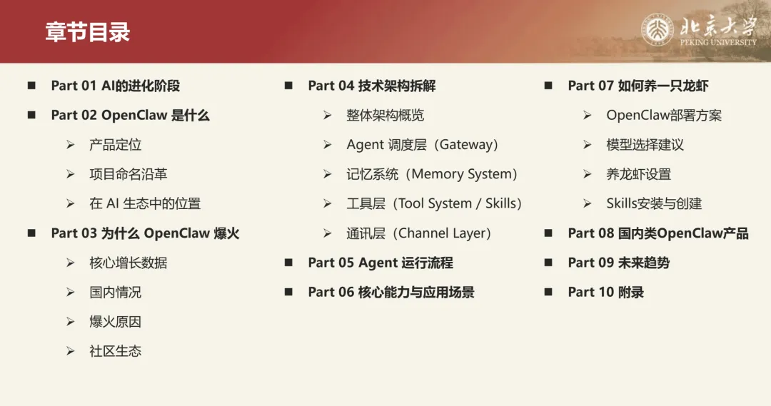 北京大学出品的这份OpenClaw教程包含了AI进化史、OpenClaw是什么以及为什么火了、OpenClaw的技术架构、运行流程、核心能力以及应用场景、怎么开始养一只龙虾?国内有哪些类OpenClaw的产品,未来什么走向,这些在这份教程都有做了解读。