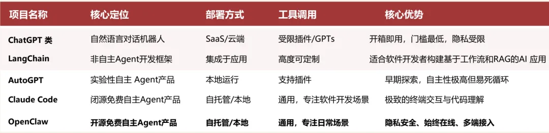 教程中还给出了OpenClaw与其他的AI产品的对比,分别从核心定位、部署方式、工具调用和核心优势等多个维度展开了对比,我觉得看了之后,对其他的AI产品会有更加系统化的认知。