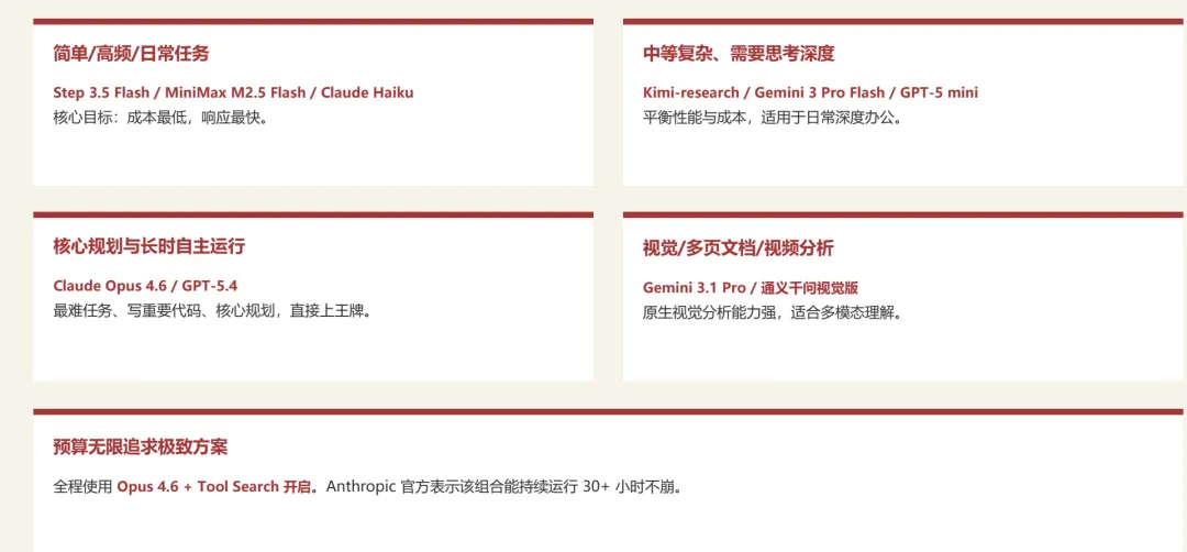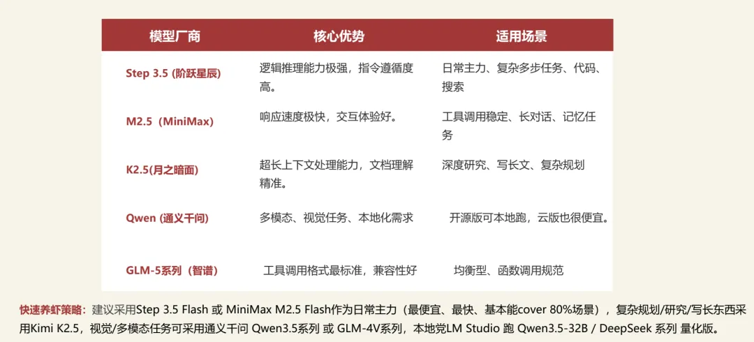 教程中还给出了快速养虾模型选择的策略,说实在话,这部分的内容,即使是外面付费的课程可能都没有这个列举的这么全面。