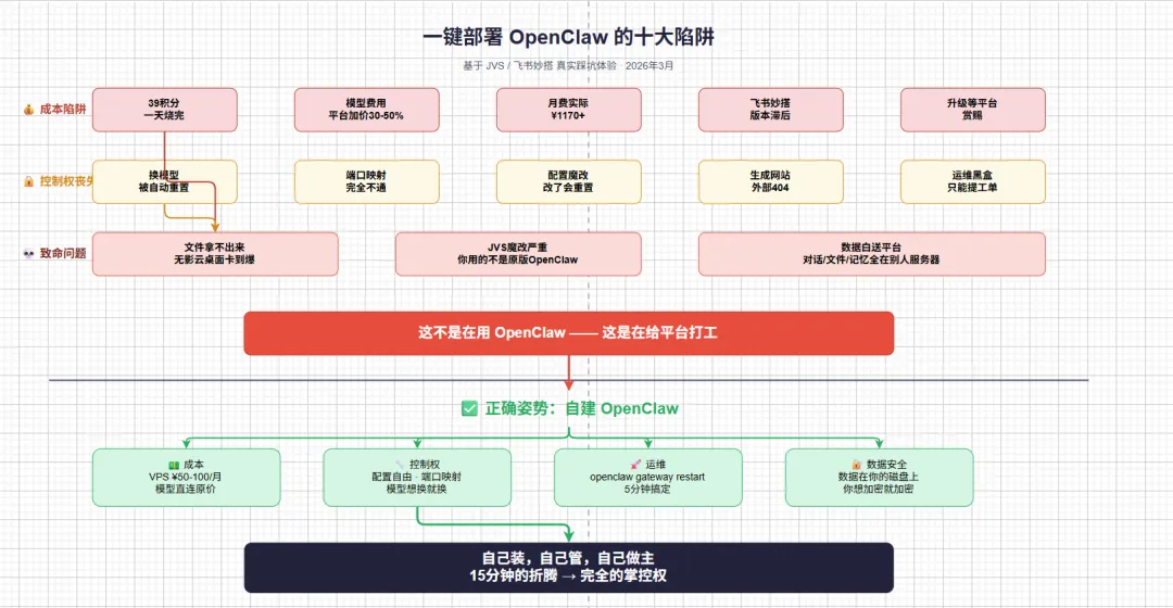 本文基于 2026 年 3 月的真实使用体验撰写。某VS 平台 1600积分实测一天耗尽,模型配置被自动重置,端口映射不通,文件传输依赖某里有影云桌面体验极差。某书妙搭同样存在版本滞后和配置受限问题。以上问题均非 OpenClaw 本身缺陷,而是平台托管模式的固有弊端。