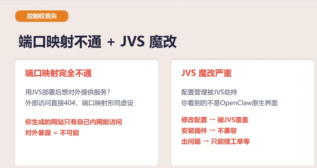 • 配置管理重写:你的改配置行为被平台劫持,不是直接改文件 • 进程管理定制:Gateway 的启停逻辑和官方不一致 • Skill 安装限制:部分 Skill 因为权限或网络原因装不上 • 日志系统阉割:你看到的日志是平台过滤后的,不是完整日志 • 心跳机制修改:心跳频率和行为可能和官方版不同